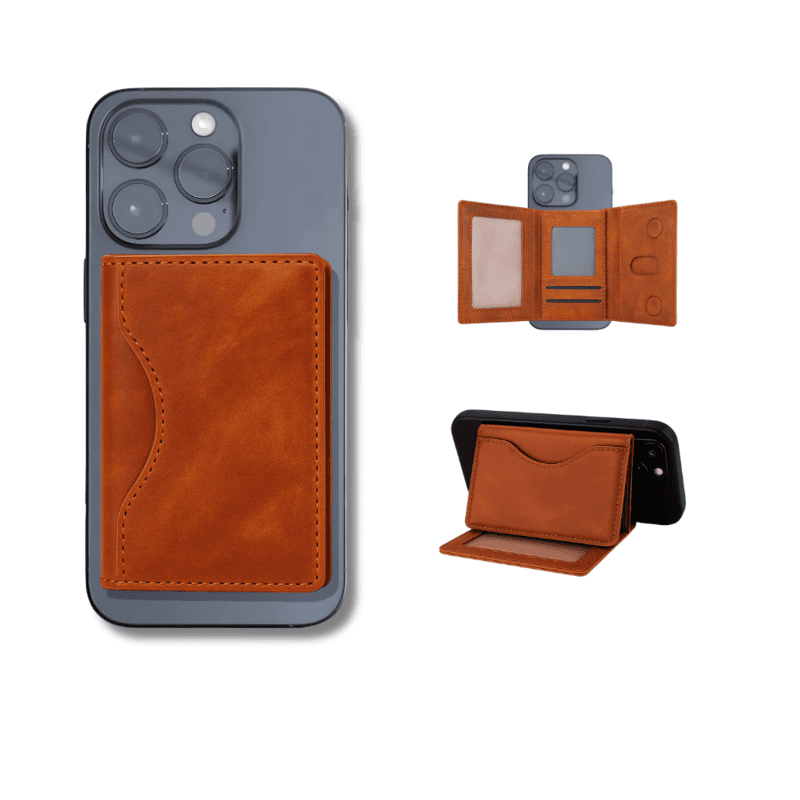 Stay hands-free and clutter-free with our Magnetic Leather Phone Wallet & Stand, the ultimate all-in-one accessory for your mobile essentials. Say goodbye to bulky wallets — this sleek design attaches securely to your phone or MagSafe-compatible case using powerful built-in magnets or strong adhesive, then folds into a stable stand for convenient hands-free viewing.